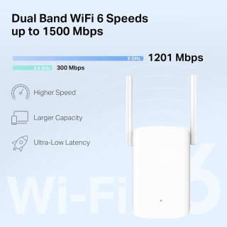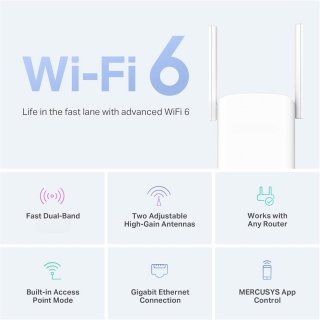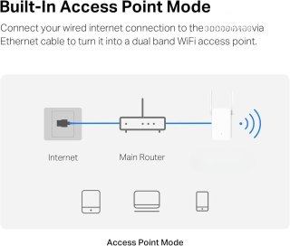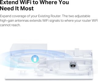 Het witte, compacte ontwerp is gemaakt om direct in een stopcontact geplaatst te worden zonder veel ruimte innemen. Met twee interne antennes biedt het toestel een solide signaalversterking, terwijl beveiligingsopties zoals WPA3 je netwerk extra beschermen.
